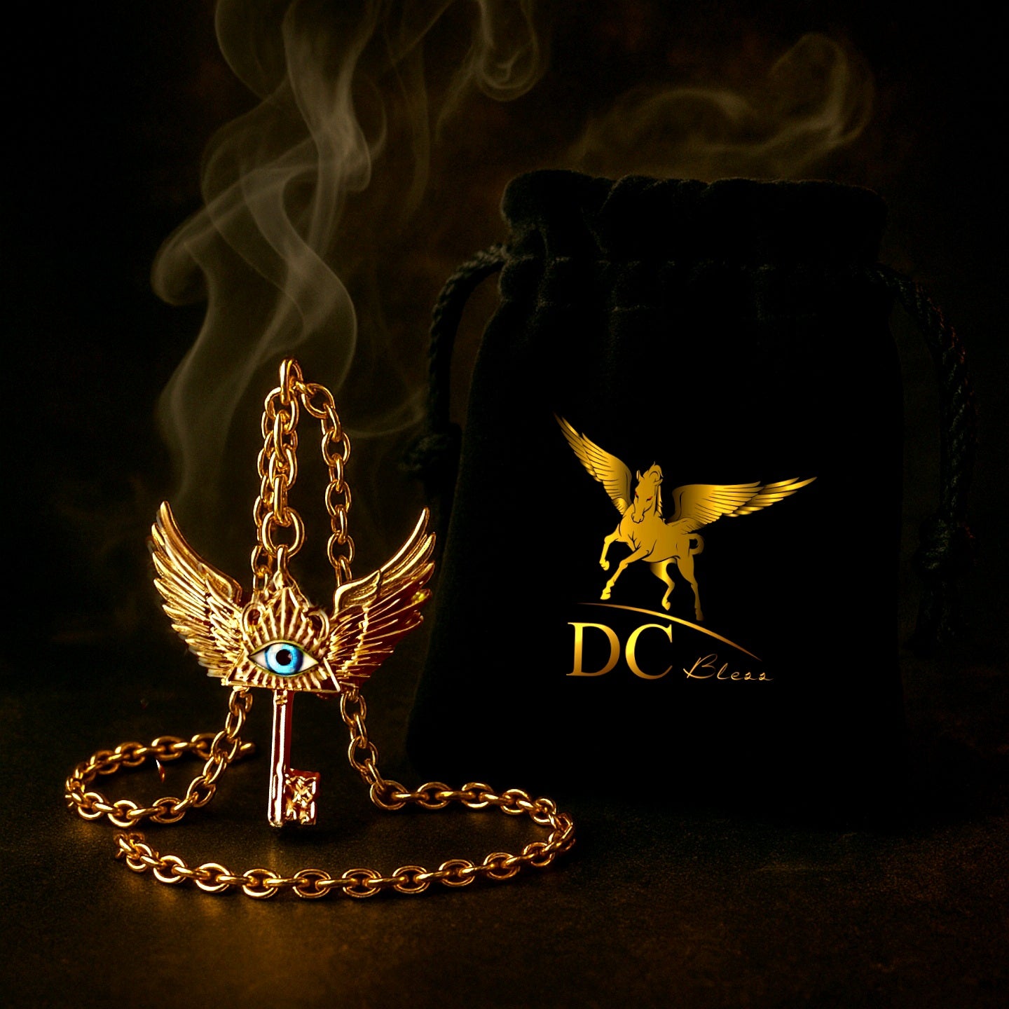 Ambalaj premium: săculeț de catifea neagră cu logo DC Bless ștanțat auriu – elegant, mistic, perfect pentru daruri ritualice
