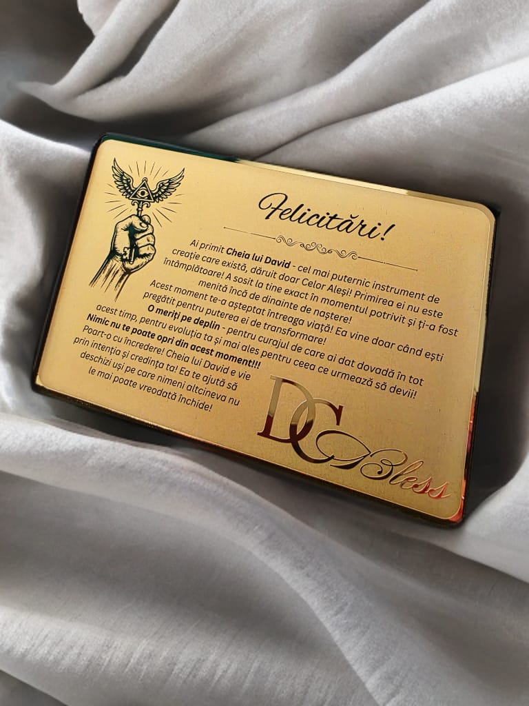 🪙 Felicitare metalică gravată: mesaj inspirațional exclusivist, imprimat pe placă aurie premium din seria cardurilor V.I.P. cu textul - „Felicitări! Ai primit Cheia lui David – cel mai puternic instrument de creație care există, dăruit doar Celor Aleși! Primirea ei nu este întâmplătoare! A sosit la tine exact în momentul potrivit și ți-a fost menită încă de dinainte de naștere! Acest moment te-a așteptat întreaga viață! Ea vine doar când ești pregătit pentru puterea ei de a-ți transforma viața! O meriți pe deplin – pentru curajul de care ai dat dovadă în tot acest timp, pentru evoluția ta și, mai ales, pentru ceea ce urmează să devii! Nimic nu te poate opri din acest moment!!! Poart-o cu încredere! Cheia lui David e vie prin intenția și credința ta! Ea te ajută să deschizi uși pe care nimeni altcineva nu le mai poate vreodată închide!”