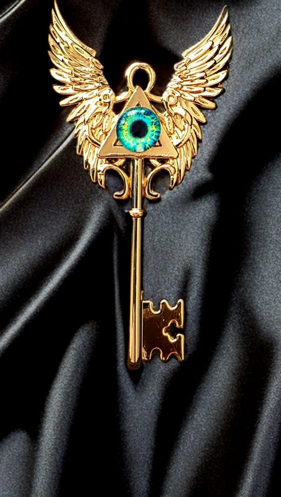 🔑 Cheia lui David – DC Bless: design detaliat, placată cu auriu, cu aripi sculptate și ochișor central decorativ pe nuanța albastru-verzui