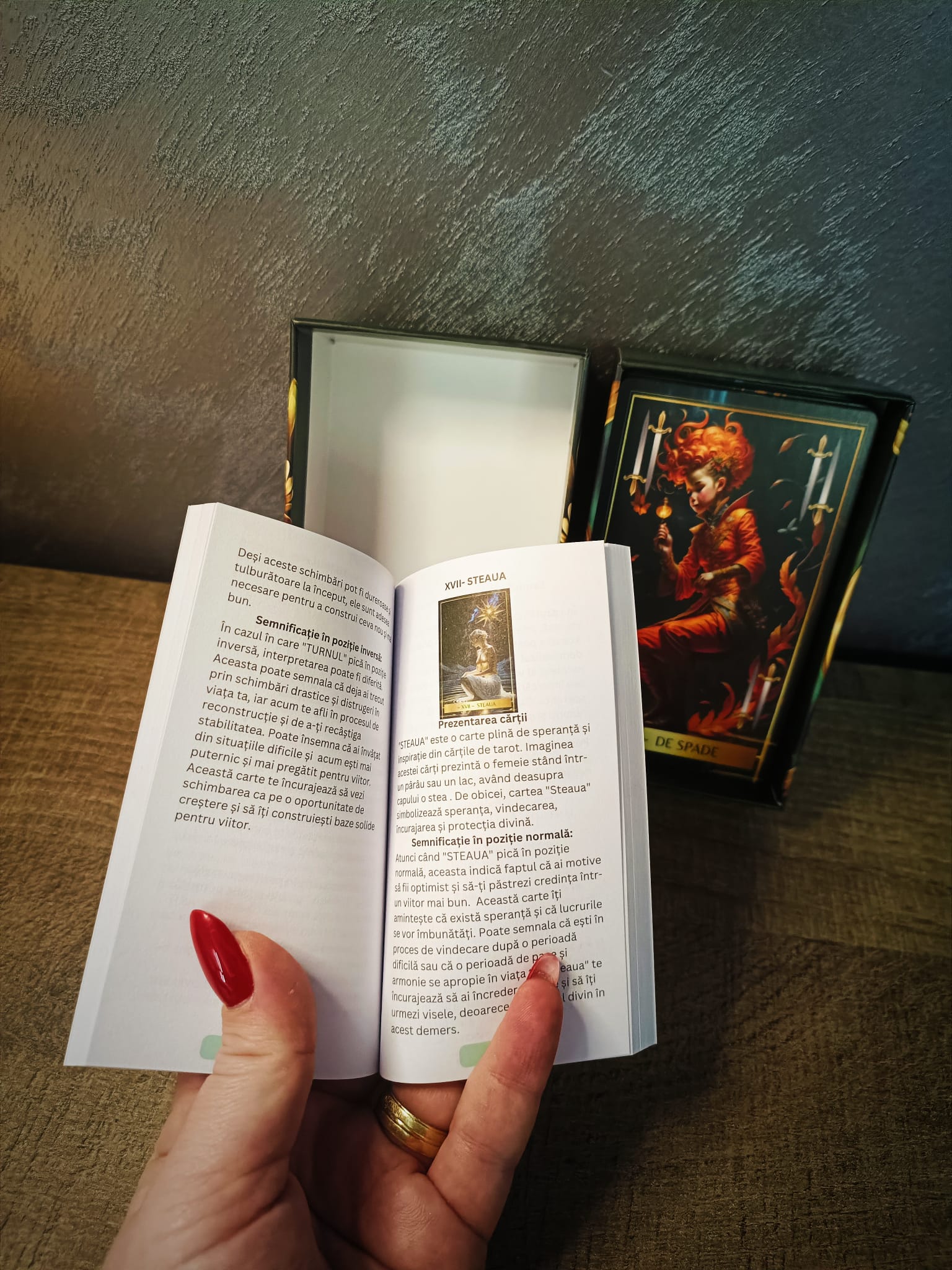 Broșură explicativă în limba română, de 145 de pagini color, care te ghidează în înțelegerea fiecărei cărți și a modului în care le poți interpreta intuitiv.